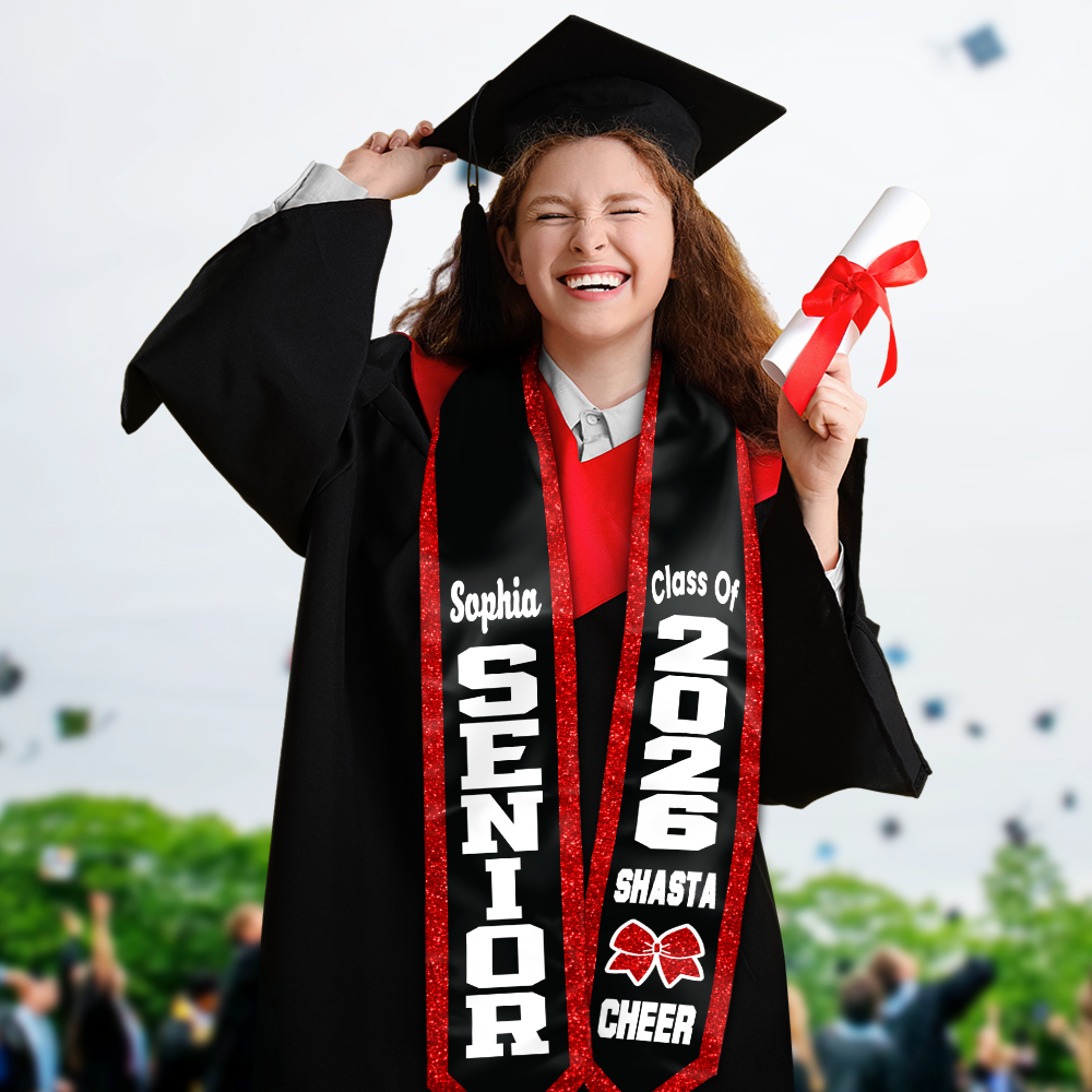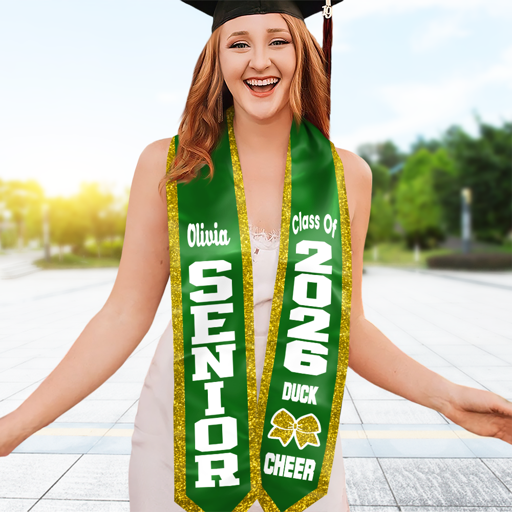 Celebrate your senior cheerleader's milestone with a custom graduation stole designed just for them. This personalized cheer stole combines school spirit with timeless elegance, featuring custom embroidery that captures their name, graduation year, or favorite cheer motto. Perfect for graduation photos, ceremonies, and keepsakes, it's a meaningful way to honor their dedication to the squad and their achievements. Whether worn over the graduation gown or displayed proudly at home, this stole becomes a cherished memento of their cheerleading journey and academic success.