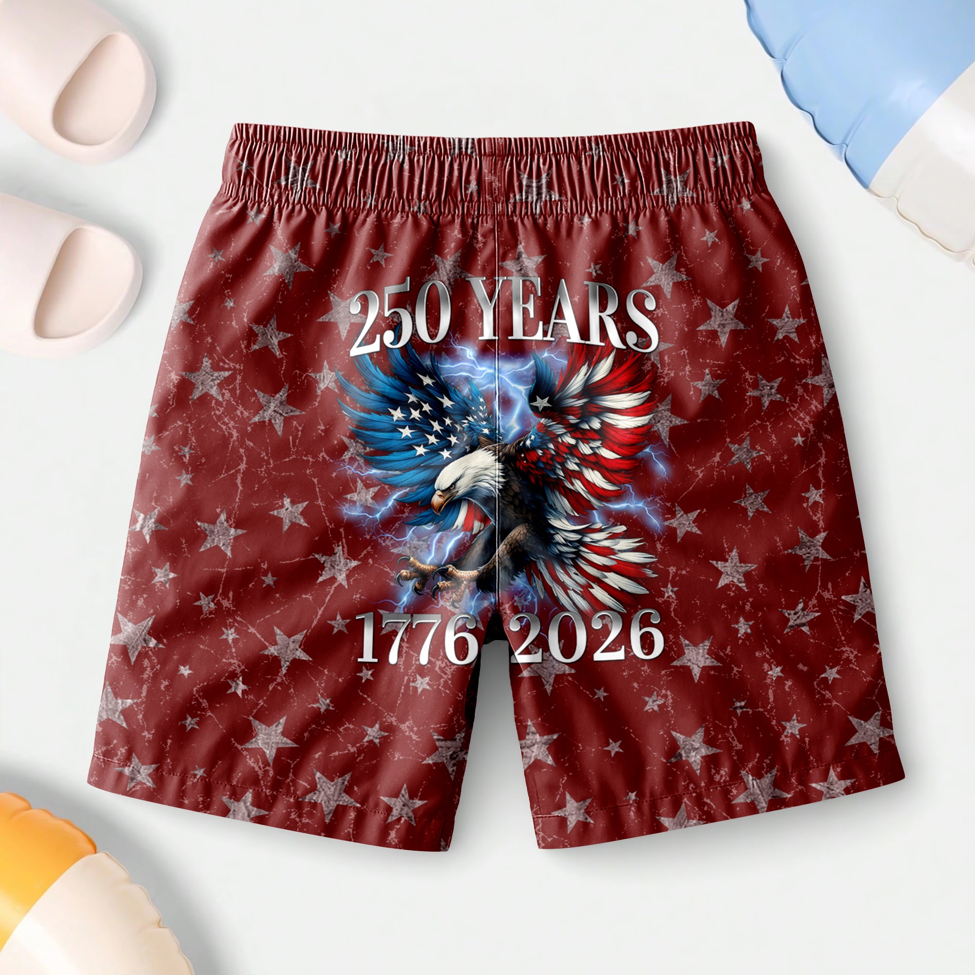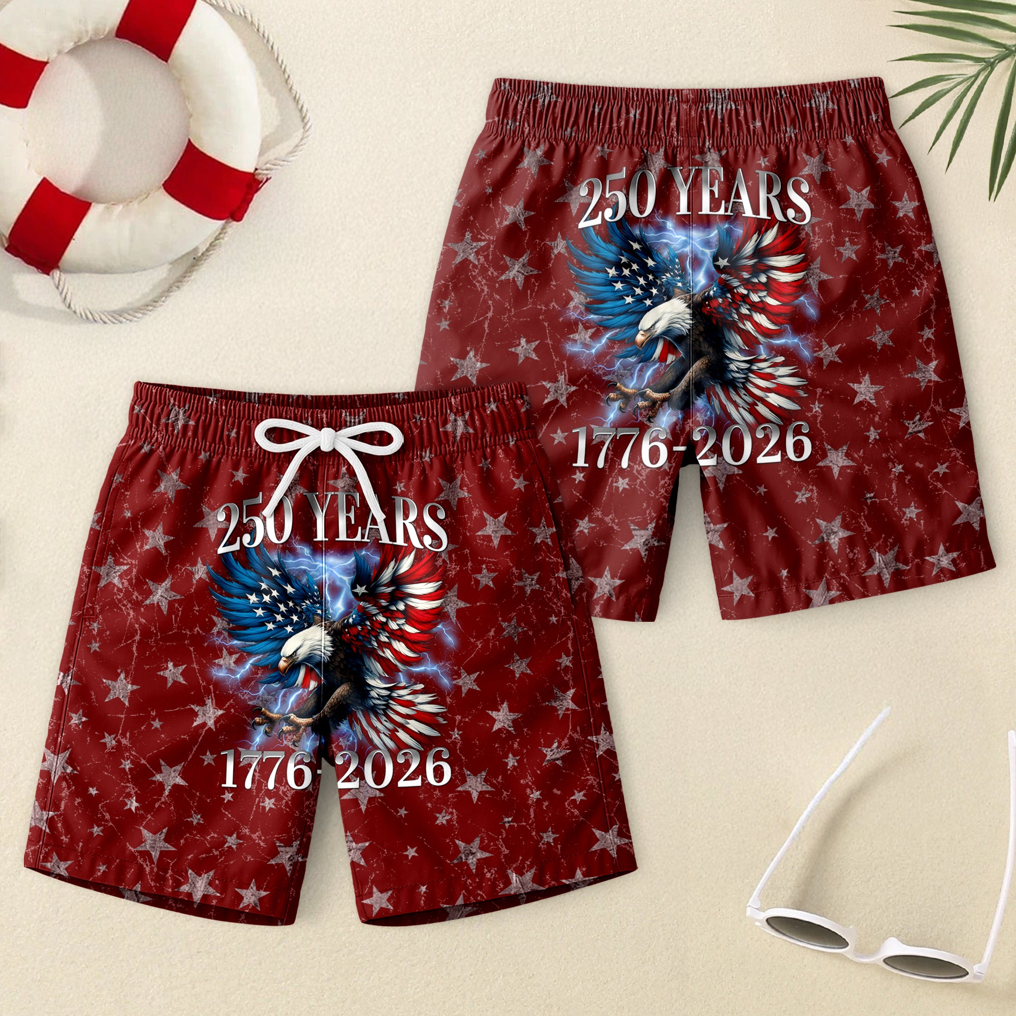 Celebrate America’s 250th anniversary with these 1776–2026 Eagle Patriotic Beach Shorts. Featuring a bold eagle design with patriotic elements, they’re perfect for beach days, vacations, or Independence Day. Available in multiple background colors, they let you choose the style that suits you best. Lightweight and comfortable, they’re a standout piece for the season.