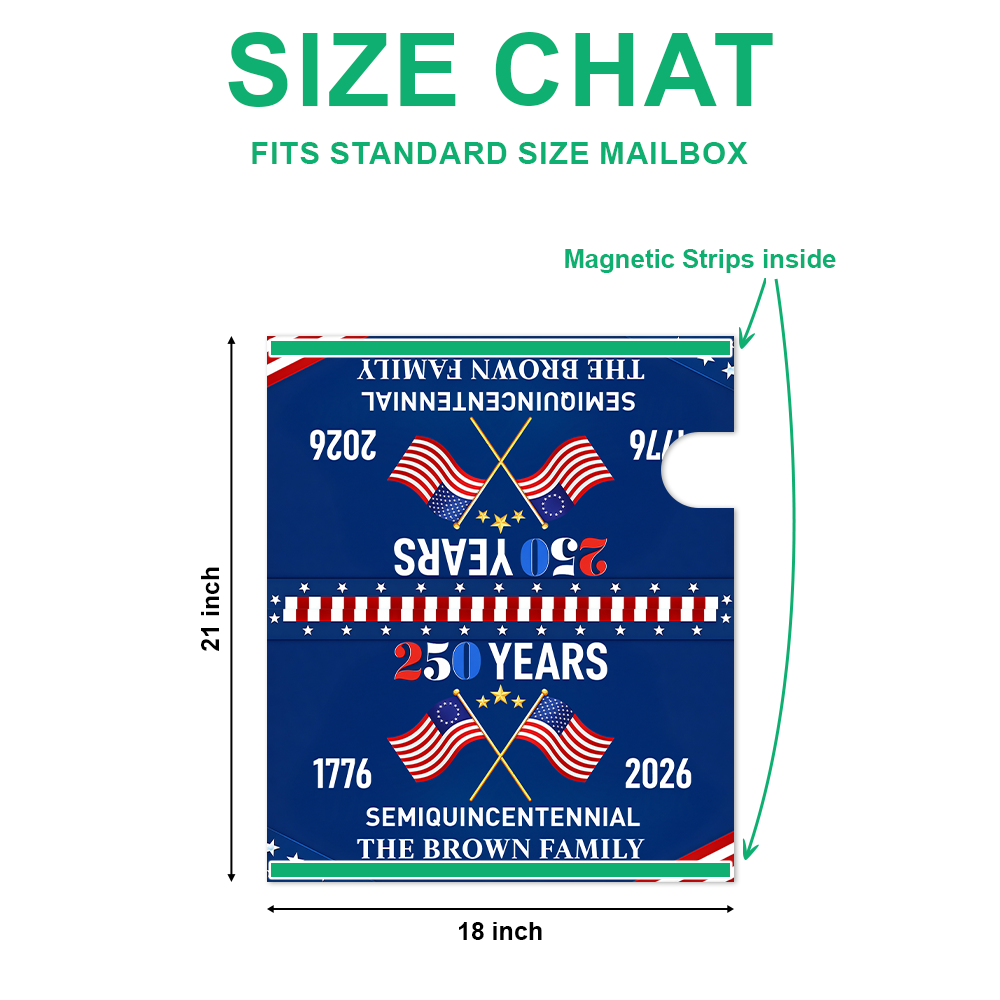 Celebrate a quarter-millennium of family heritage with this exclusive 250th anniversary mailbox cover. Personalized with your family name, this patriotic design honors semiquincentennial milestones in style. Crafted for durability, it transforms your mailbox into a meaningful statement piece that reflects your family's enduring legacy and American pride. Perfect for commemorating generations of history, this custom cover adds distinguished character to your home's curb appeal while protecting your mail. Whether marking a personal family anniversary or celebrating the nation's heritage, this personalized mailbox cover serves as a lasting tribute to tradition and continuity. Make your mailbox a conversation starter that tells your family's unique story for years to come.