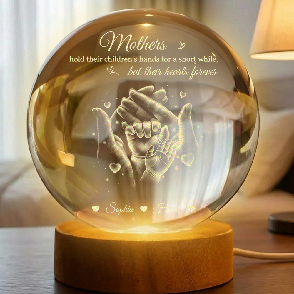 Capture the warmth of family love with this enchanting personalized crystal ball night light. Each handprint is custom-engraved to showcase your loved ones' unique touch, creating a meaningful keepsake that glows softly through the night. The gentle LED illumination casts a soothing ambiance perfect for bedrooms, nurseries, or living spaces. Ideal for parents, grandparents, and families seeking a heartfelt gift that celebrates togetherness. This treasured piece transforms ordinary moments into lasting memories, making it the perfect present for Mother's Day, Father's Day, or any occasion worth commemorating.