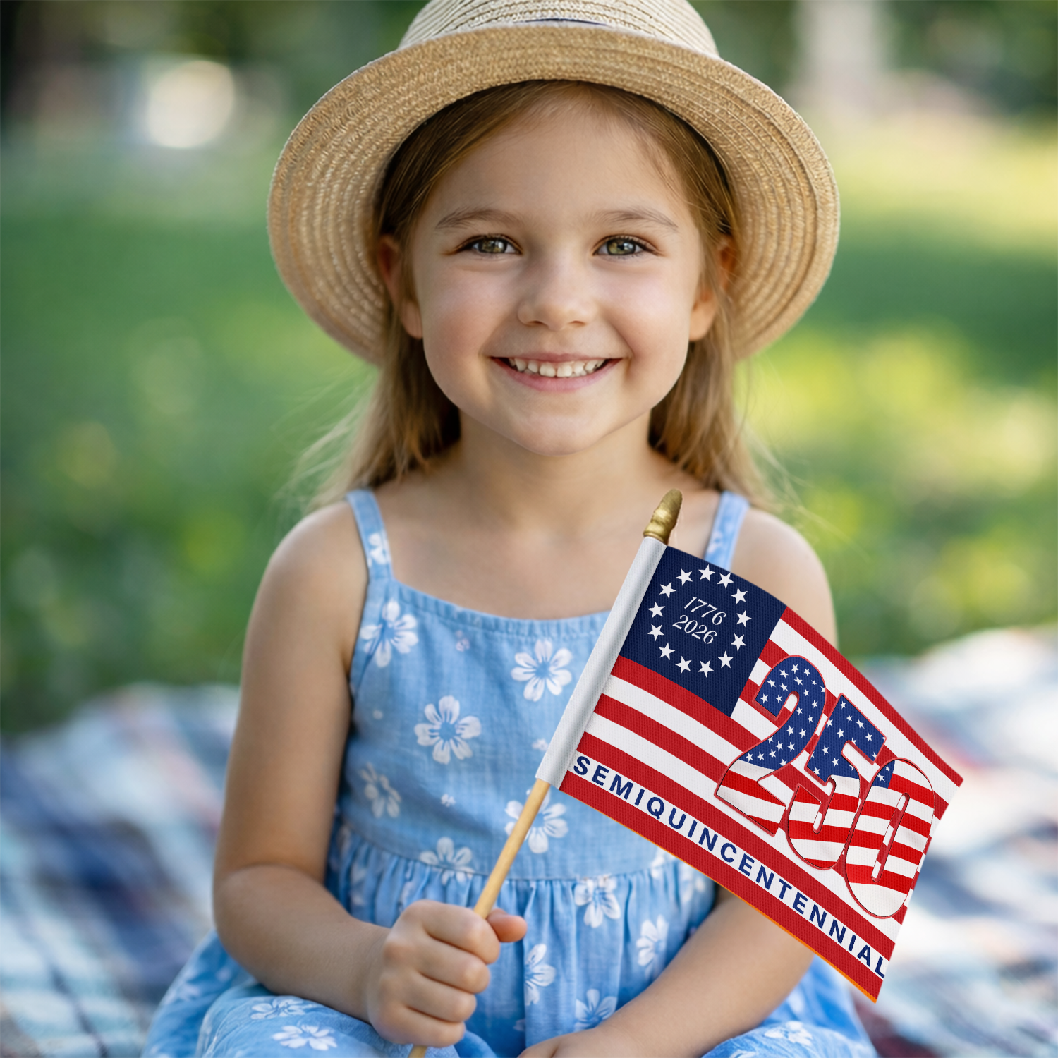 Celebrate America's 250th anniversary with this commemorative handheld flag, marking the nation's semiquincentennial milestone. Perfect for parades, patriotic gatherings, and historical celebrations, this flag lets you show your pride in a quarter-millennium of American history. The convenient handheld design makes it easy to wave at events, demonstrations, and community gatherings throughout 2026. Durable construction ensures it withstands outdoor conditions while maintaining vibrant colors. Whether you're a history enthusiast, collector, or patriotic citizen, this special edition flag is an ideal way to participate in one of America's most significant commemorative years. Don't miss the chance to own a piece of this historic moment.