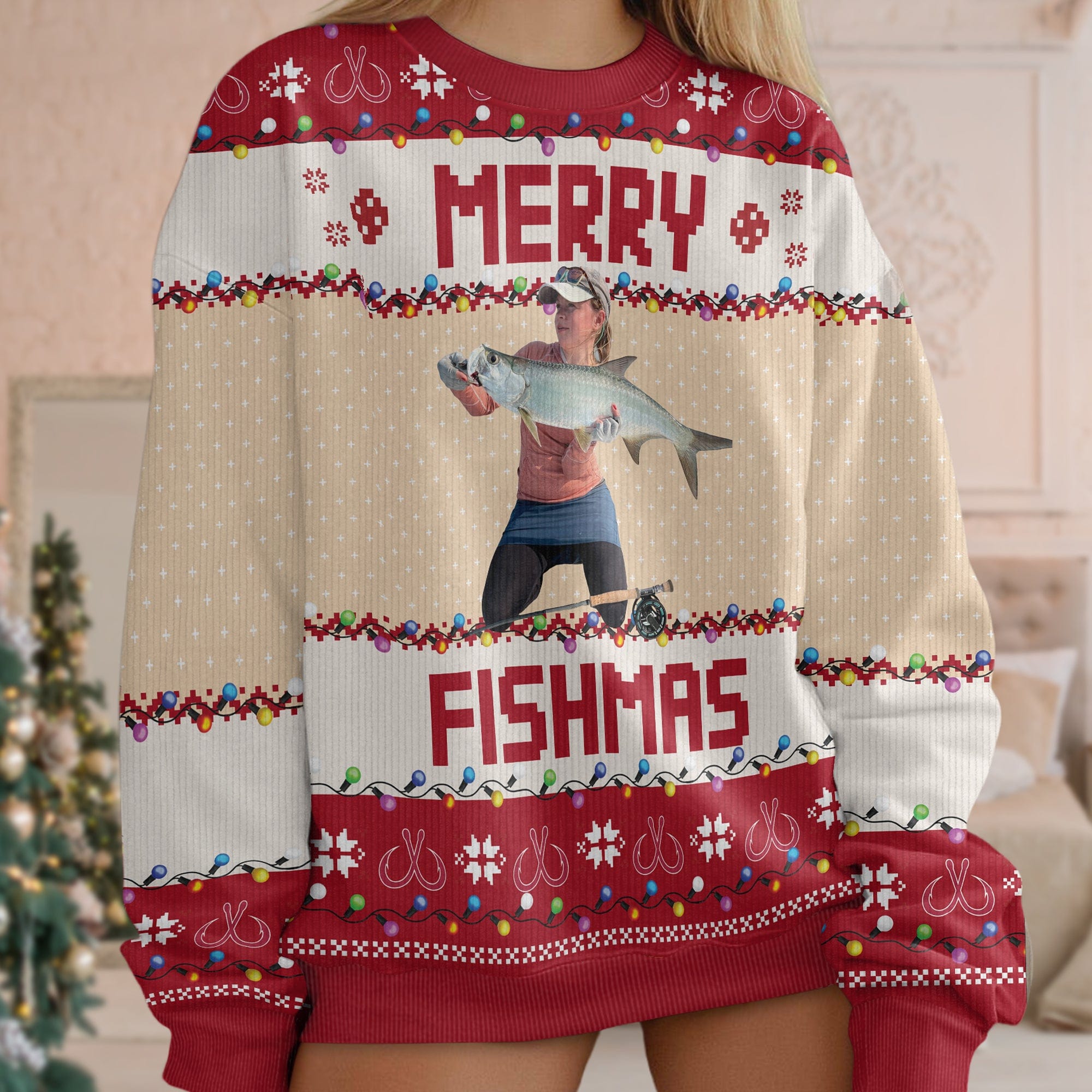 Get ready to make a splash with our Custom Photo Merry Fishmas Gift! Designed for fishing lovers, this ugly sweater is the perfect way to show off your passion for the sport. With a custom photo, it's a one-of-a-kind gift that is sure to make a statement. Jump into the holiday season with this unique and fun gift!