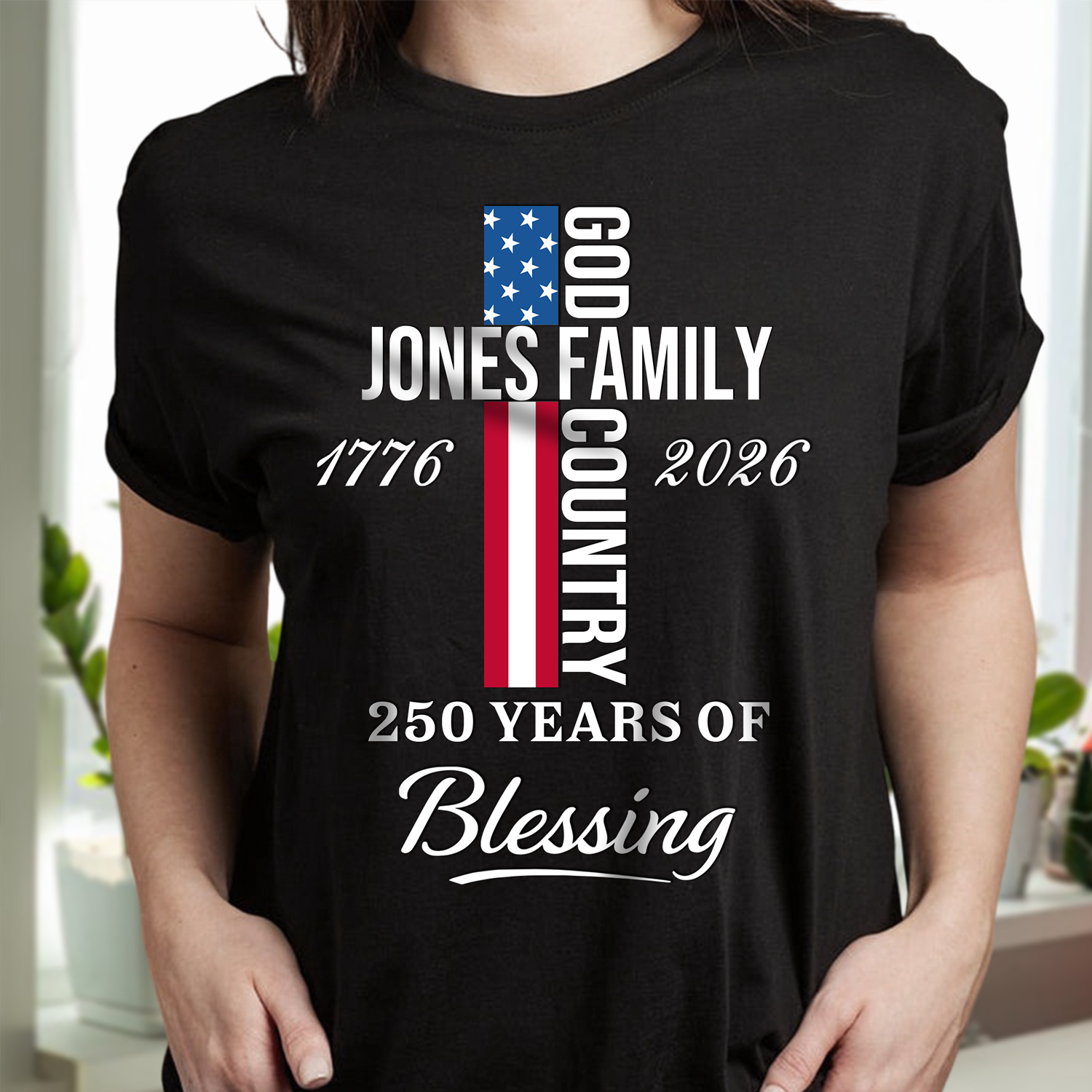 Celebrate your heritage with this striking patriotic family name shirt, honoring 250 years of American blessings. Featuring bold, meaningful design elements that blend faith and national pride, this dark shirt makes a powerful statement about your values. Perfect for family gatherings, patriotic events, or everyday wear, it's a wearable testament to gratitude and tradition. A true gift for those who cherish their roots and believe in America's enduring spirit. Wear it with pride—this is more than a shirt, it's a blessing.