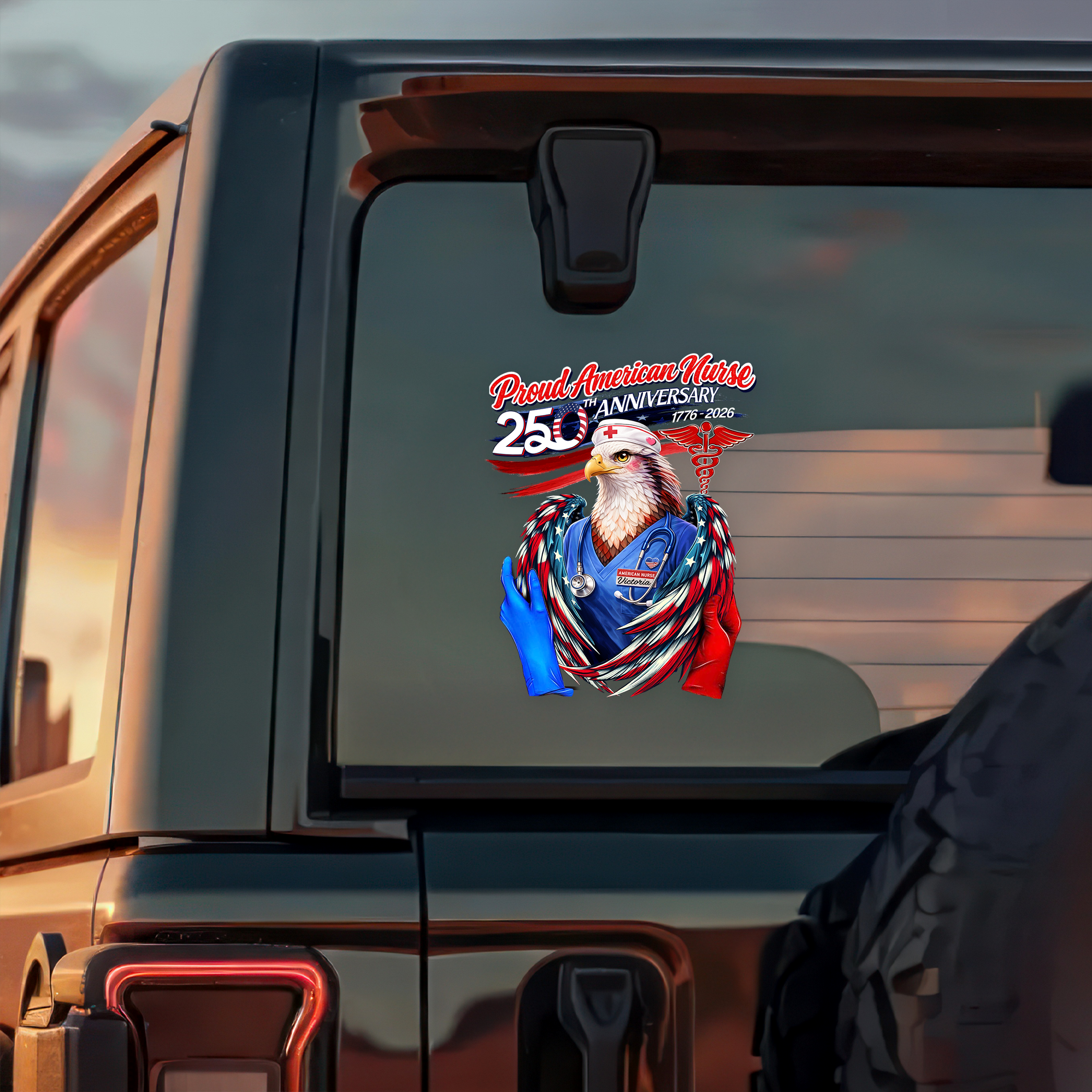 Celebrate your dedication to nursing with this striking personalized car window decal, custom-designed to honor your name and profession. Perfect for the 250th anniversary milestone, this decal combines patriotic pride with professional recognition, letting fellow drivers know about the American hero behind the wheel. Made for durability and visibility, it's an ideal way for nurses to showcase their commitment to healthcare while adding a personal touch to your vehicle. Display your calling with pride—because every shift matters.