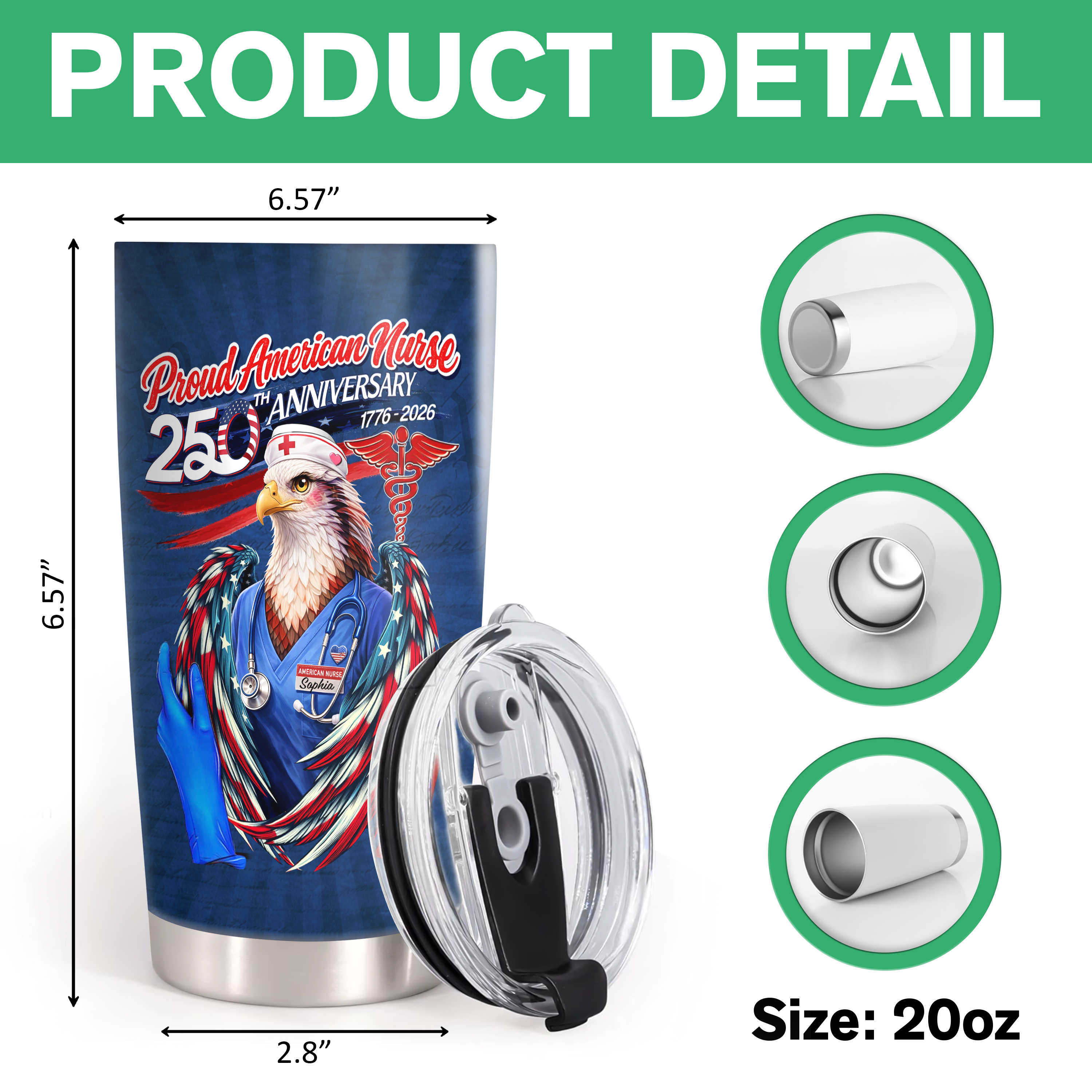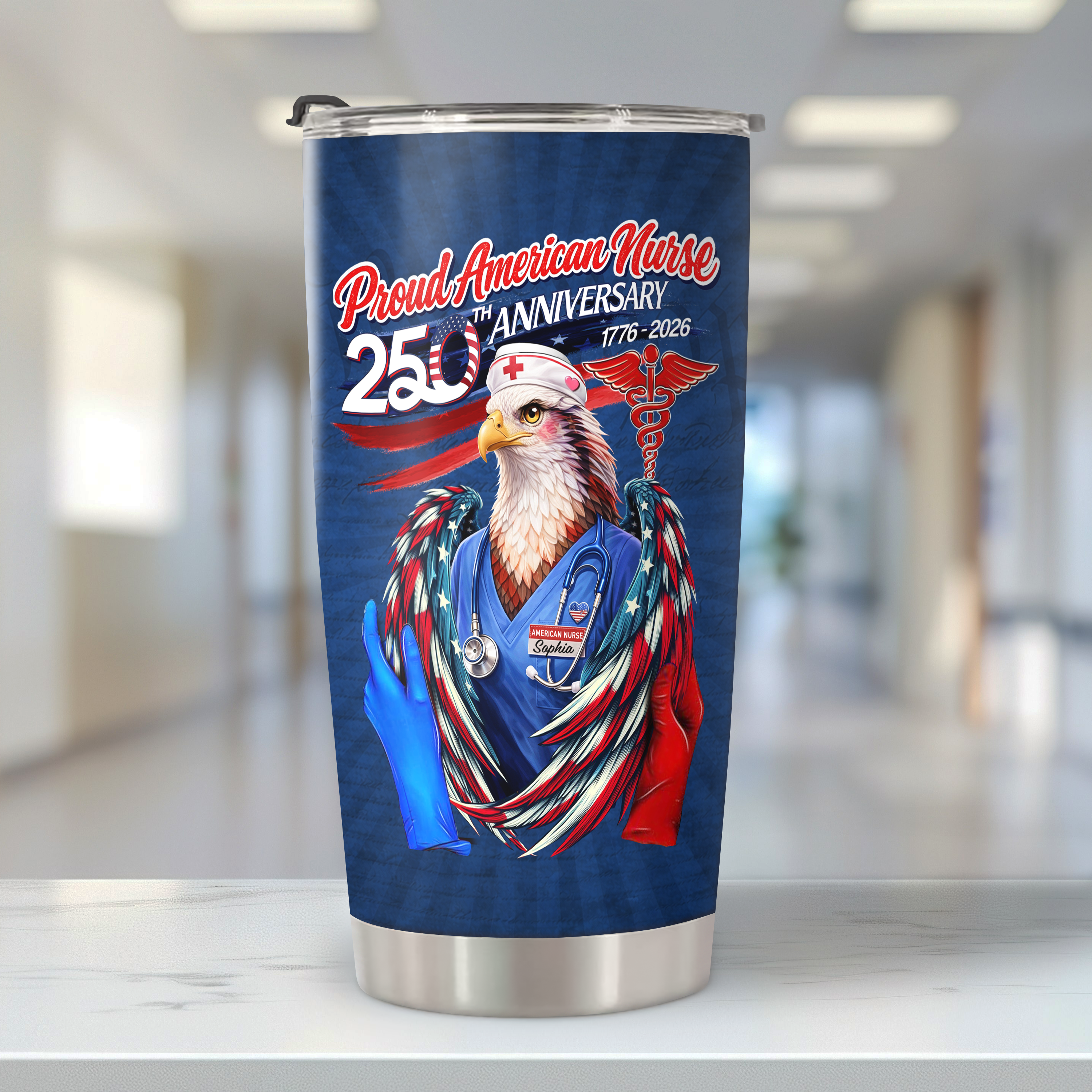 Celebrate American nursing excellence with this striking personalized tumbler honoring 250 years of dedicated service. Perfect for the nurse in your life, this custom fat tumbler features a bold 1776-2026 design that pays tribute to the profession's proud legacy. Keep beverages at the ideal temperature while displaying patriotic pride at work or home. The personalized touch makes it a meaningful gift that shows genuine appreciation for healthcare heroes. Durable construction ensures this commemorative piece becomes a cherished keepsake for years to come.