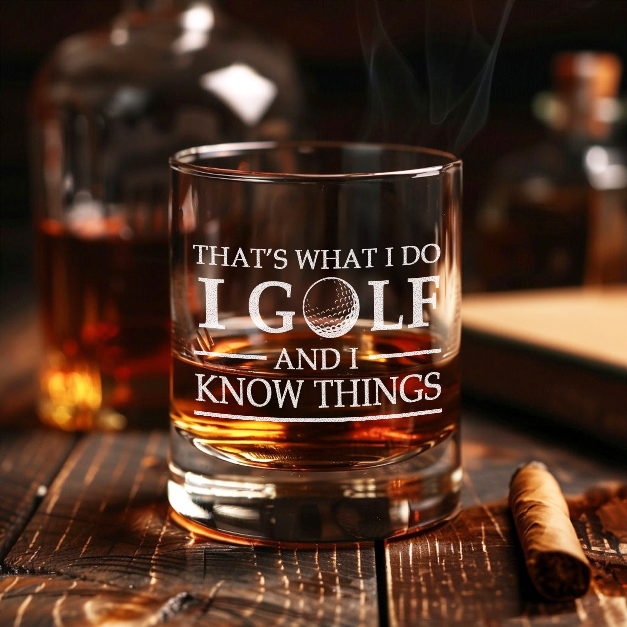 Give the gift of wit and sophistication with this personalized whiskey glass designed for the golfer who has everything. Engraved with "That's What I Do, I Golf And I Know Things," it captures the confident spirit of true golf enthusiasts while delivering a clever dose of humor. Perfect for husbands, boyfriends, and dedicated players, this custom glass celebrates their expertise and passion for the game. Each pour becomes a moment of pride, whether they're toasting a birdie or relaxing after 18 holes. Durable and elegantly crafted, it's the ideal present that combines personality with practicality—a gift that resonates with anyone who lives and breathes golf.