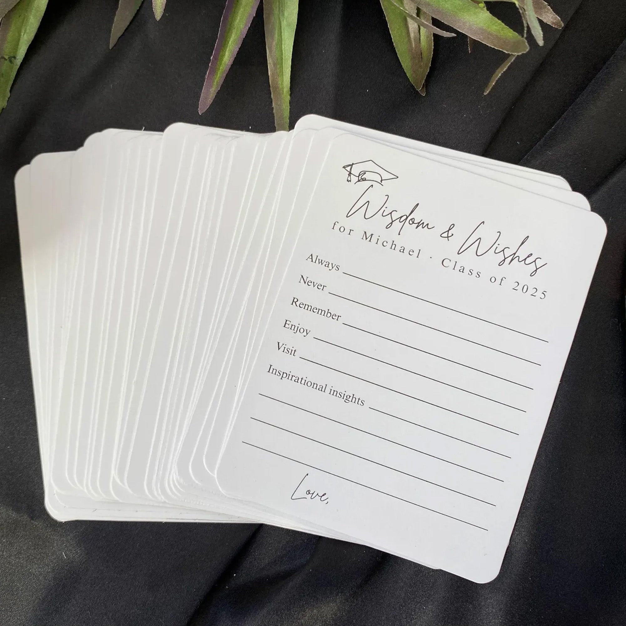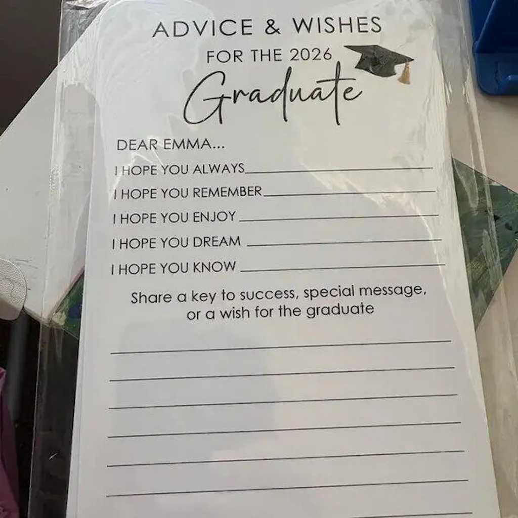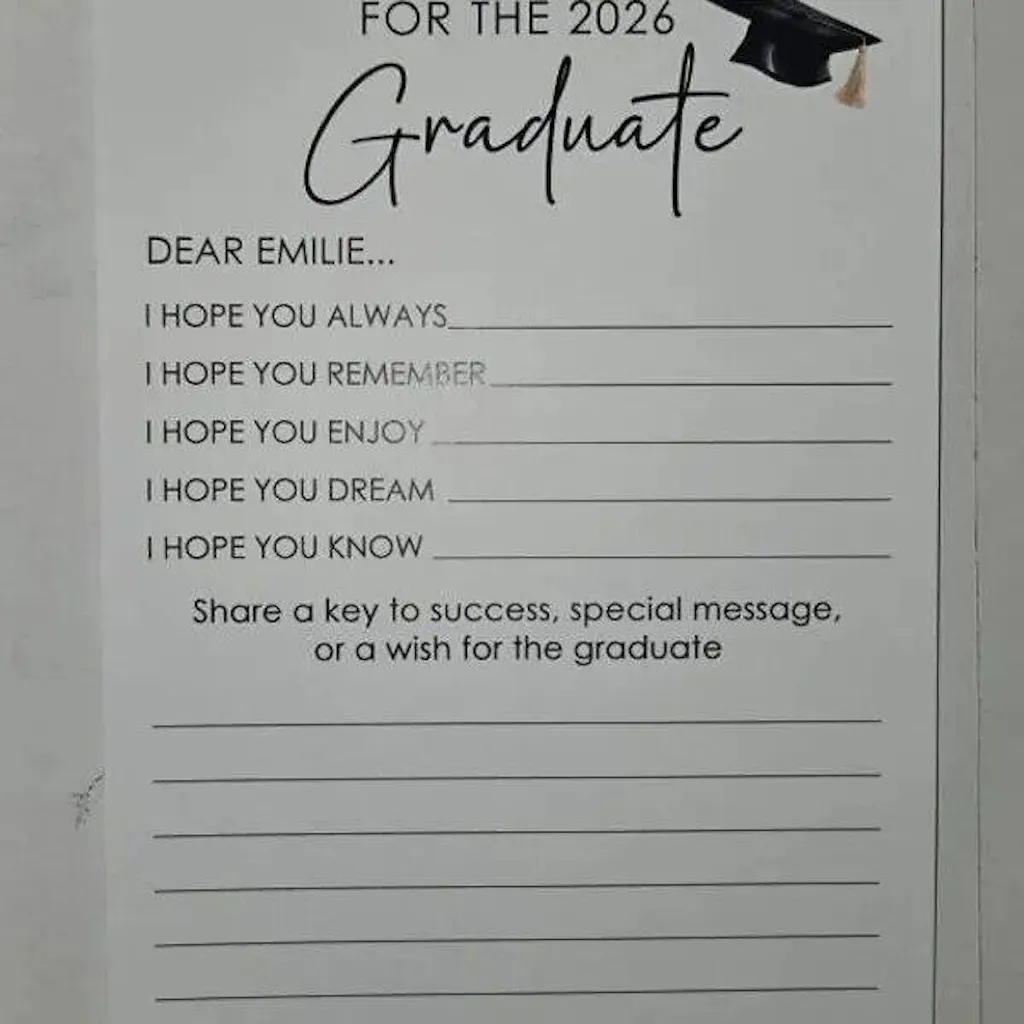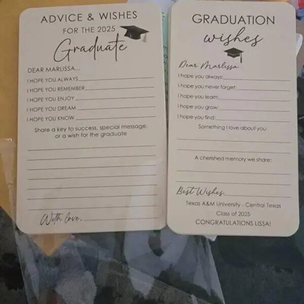 Make your celebration more meaningful with the Set of 12 Graduation Wishes Cards โ€“ Advice Cards for Graduation Party. Designed for friends and family to share heartfelt messages, advice, and well wishes, these cards add a personal touch to any graduation event. Perfect for parties, memory boxes, or keepsakes the graduate can cherish for years. A thoughtful addition to celebrate and support the Class of 2026. ๐ŸŽ“๐Ÿ’Œ