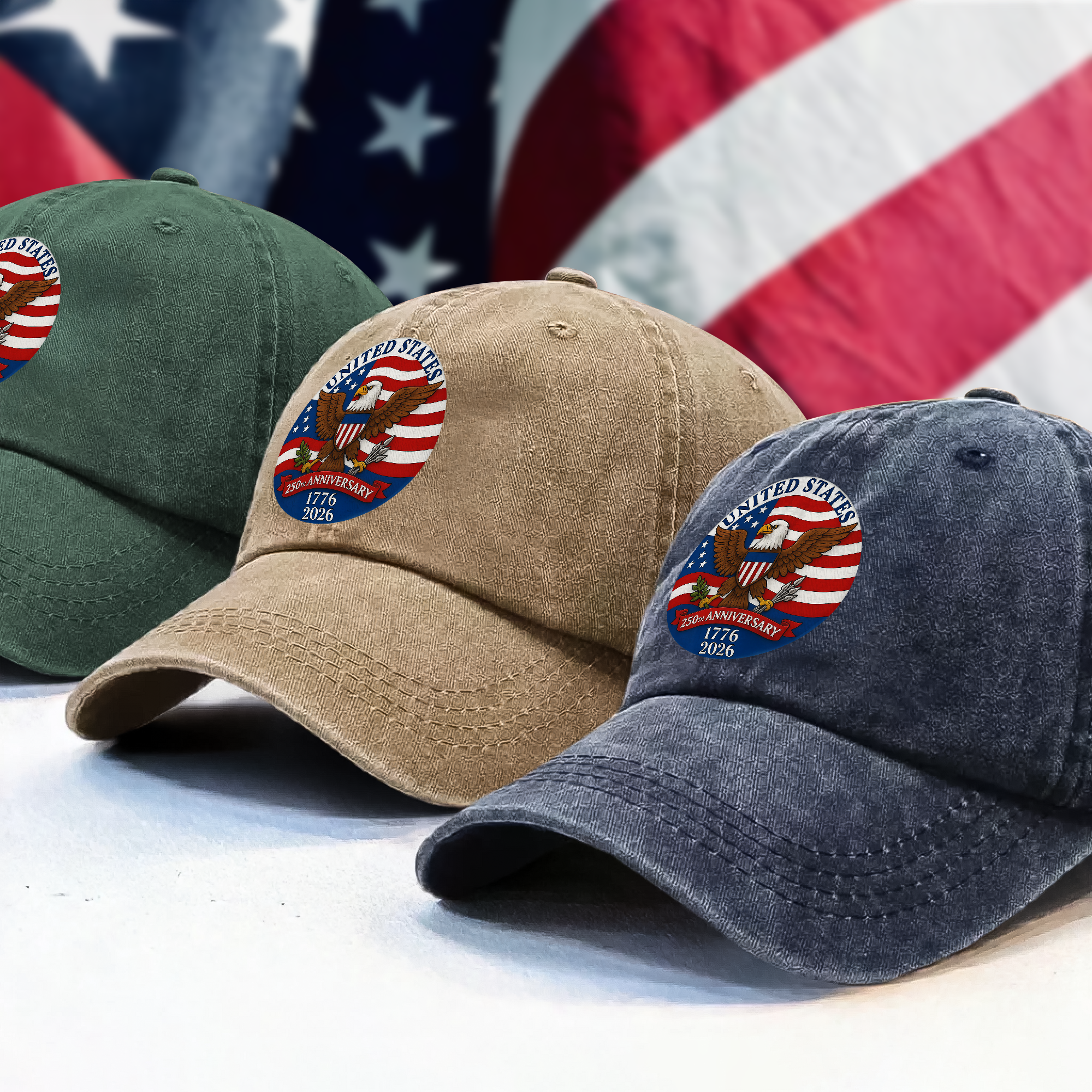 Celebrate a momentous milestone with the 1776-2026 American 250th Anniversary Eagle Washed Baseball Denim Cap. Crafted from durable denim with a stylish washed finish, this cap features a bold eagle design symbolizing American pride. Perfect for history enthusiasts and patriots alike, it offers comfortable wear and a timeless look. Gift this cap to honor 250 years of independence, making any outfit a tribute to heritage and freedom.