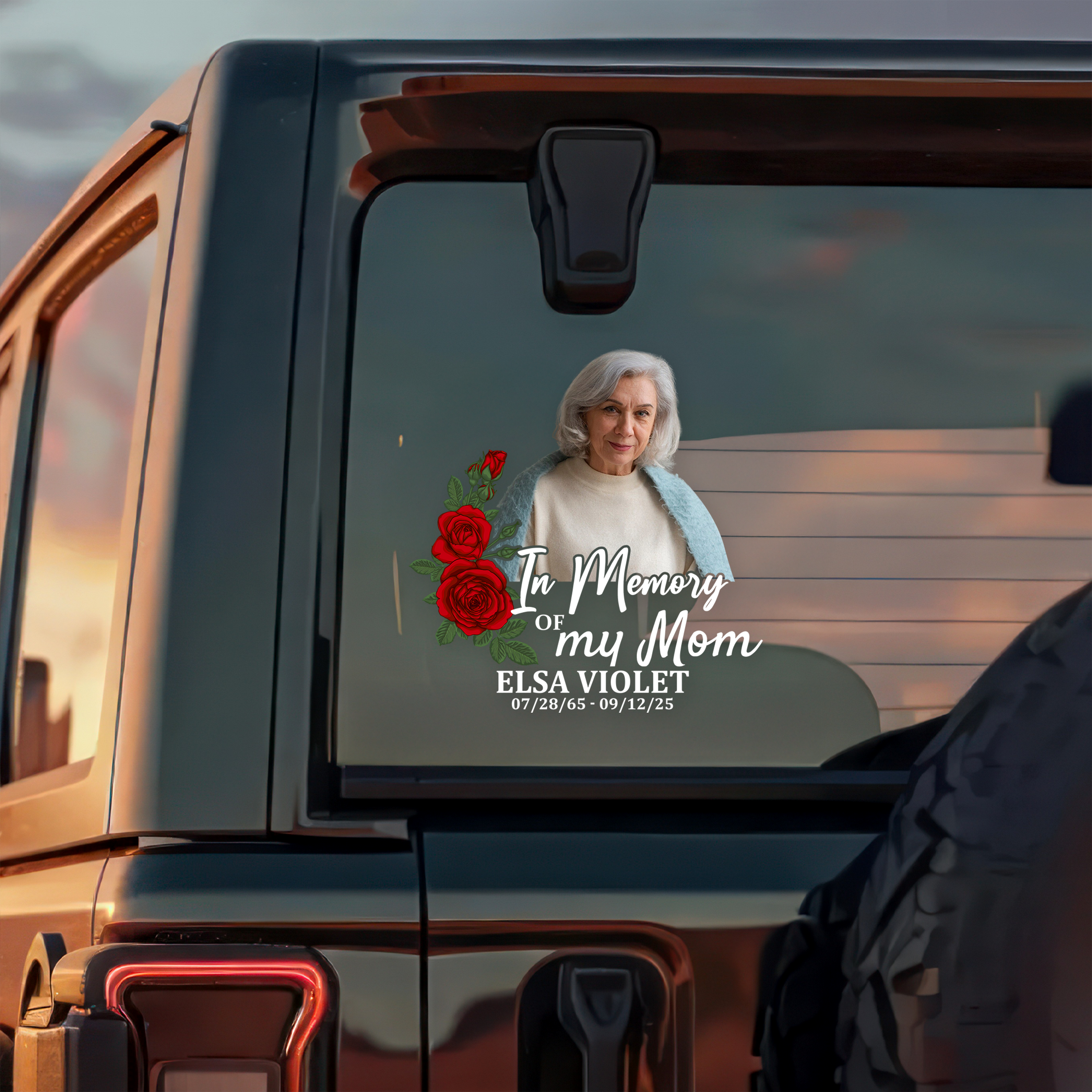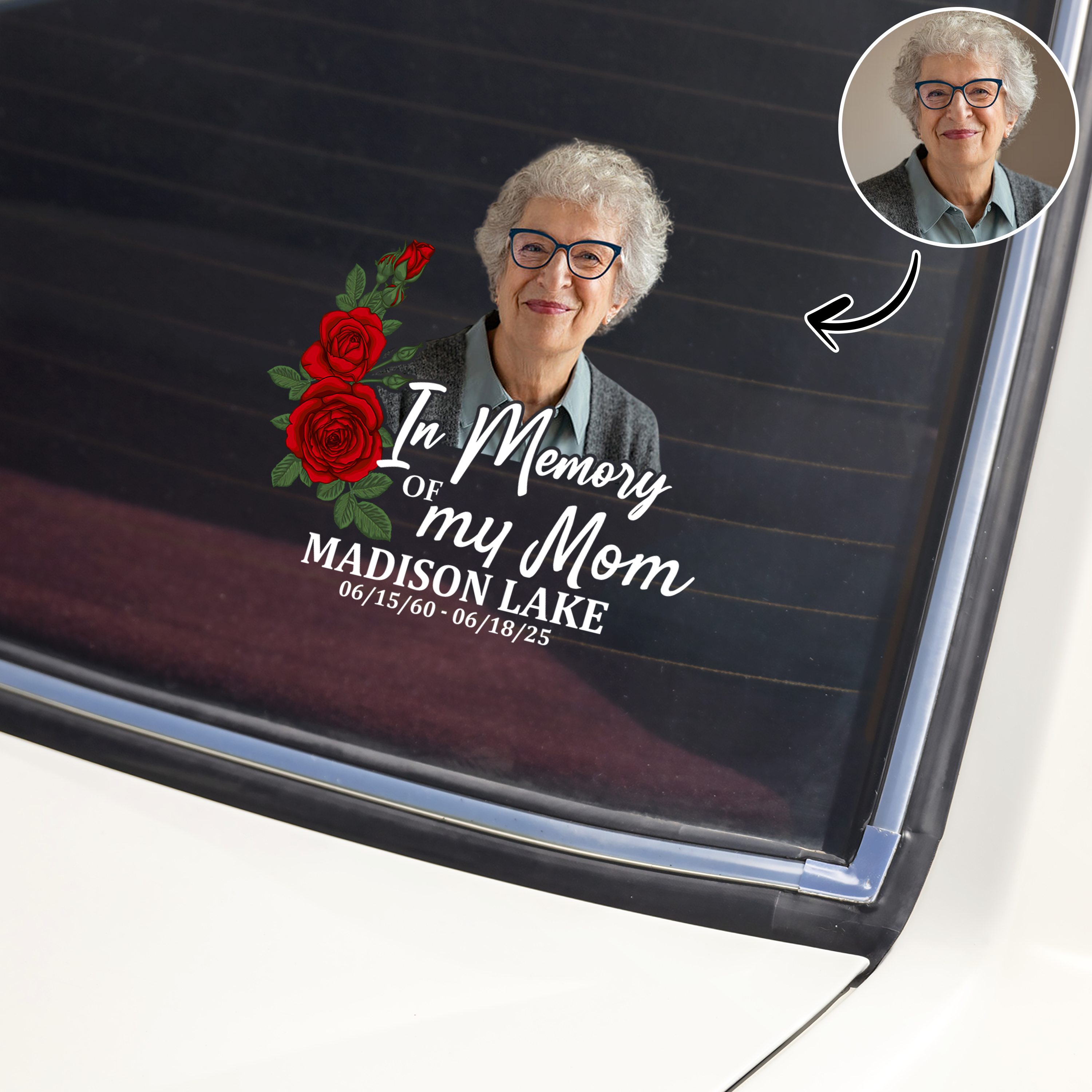 Honor your mom's memory with this personalized car window decal sticker. Display a cherished photo of her on your vehicle, creating a touching tribute that travels with you everywhere. Perfect for keeping her close to your heart during daily commutes and journeys. This custom memorial decal is crafted with durable, weather-resistant materials designed to withstand sun, rain, and road conditions while maintaining vibrant color and clarity. A meaningful way to celebrate her life and show the world what she meant to you. Personalize it with your own photo to create a one-of-a-kind keepsake that honors her legacy.